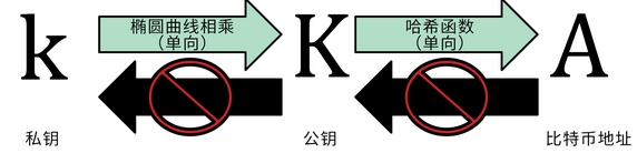 由于“私匙——>公匙——比特币地址”正向的顺序是可以的,但是这个顺序是不可逆的。